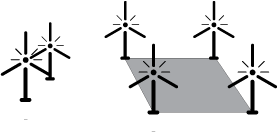 Vindmyllur - nokkrar saman og margar á stóru svæði, lýstar