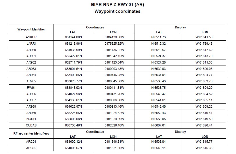 2.1 RNP Z RWY 01 (AR) kort, kóðunar- og leiðarpunktatafla