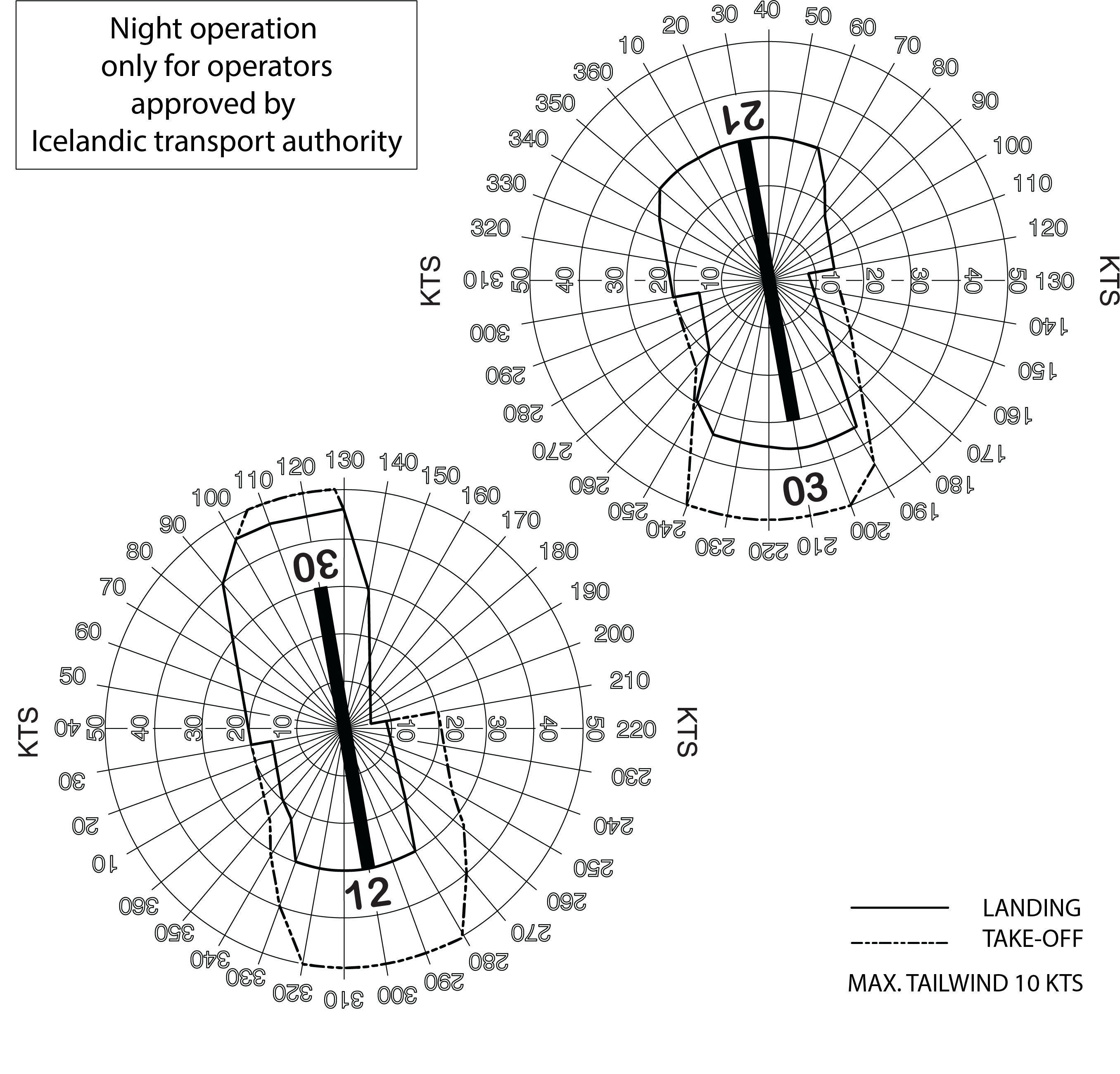 If the obstruction light at Heimaklettur is inoperative and the AFIS can confirm the ceiling is more than 700 feet, only runways 12/30 are permitted for takeoff and landing, and runway 21 for takeoff but runway 03 is closed both for takeoff and landing and runway 21 for landing. circling north of the islands is prohibited. Circling north of the islands are only permitted if all the obstruction lights are functioning.